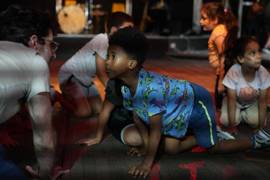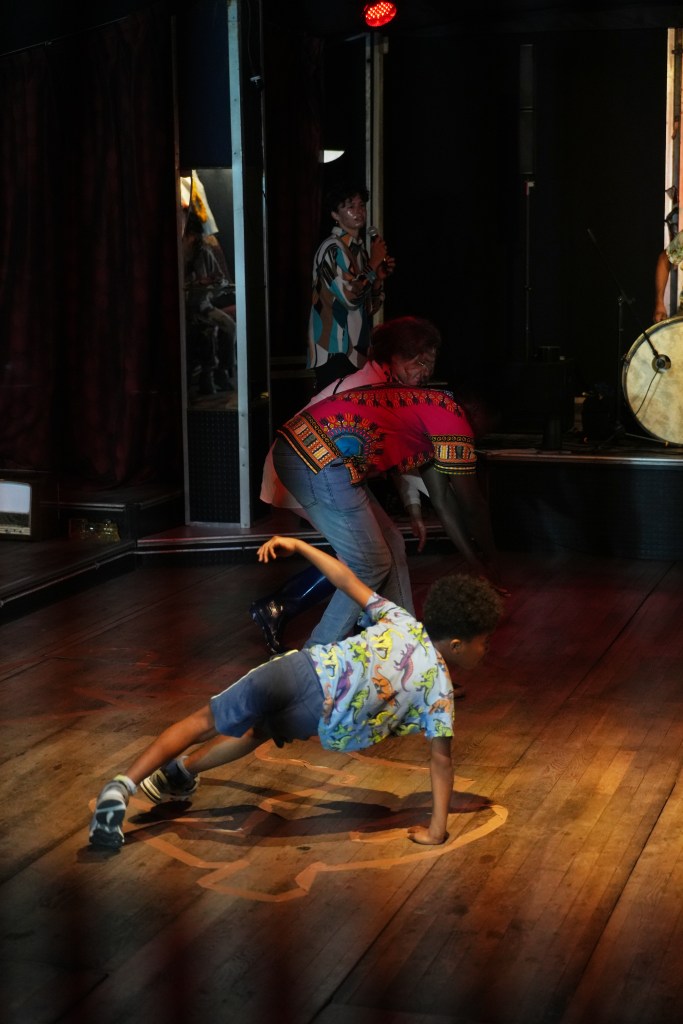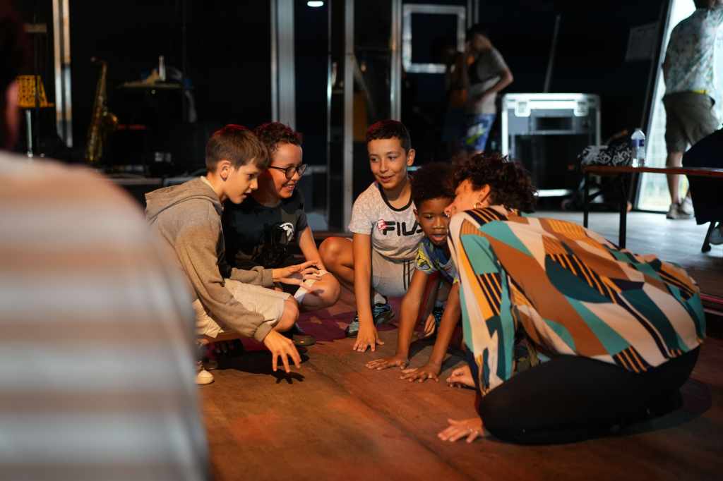 Elle rassemblait les danses des enfants, les gestes des mamans, la présence des seniors, les danses nées de la vie du groupe, et la musique live de Patricio Lisboa (contrebasse) et Vincent Sauve (saxophone), aux côtés de Laëtitia Angot, Chloé Kazemzadegan et Thomas Laroppe.